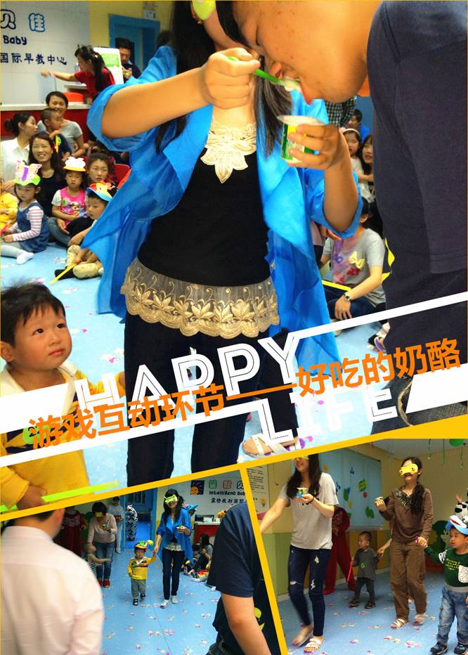 寶寶快看,爸爸媽媽在干嘛?原來這個(gè)是專門穿插的互動(dòng)游戲環(huán)節(jié)----好吃的奶酪!先來聽一下游戲規(guī)則:由寶寶帶著蒙著眼睛的媽媽帶到爸爸跟前,然后蒙著眼睛的媽媽用勺子喂爸爸吃奶酪,哪個(gè)隊(duì)先吃完的勝出。下面讓爸爸媽媽一起來大顯身手吧!