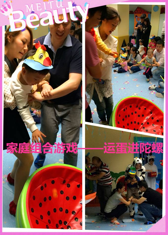 森林里小動(dòng)物的表演真是惟妙惟肖,下面要考驗(yàn)各組家庭的默契度了,運(yùn)蛋游戲規(guī)則如下:兩位家長用手做成嬌子抬著小寶寶到對(duì)面,小寶寶將手里的小球準(zhǔn)確扔進(jìn)大陀螺中,扔的球數(shù)量越多的家庭獲勝。預(yù)備,比賽開始!