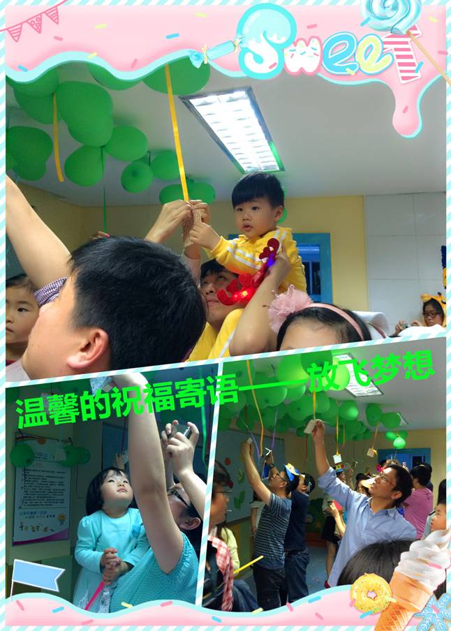 開場前,每個(gè)家長都會(huì)發(fā)放一張賀卡,上面寫上各自的心愿祝福,寶寶和爸爸媽媽合力將寫有祝福語及心愿的小卡片掛到連接氣球的彩帶上,預(yù)示著讓夢想放飛,意義深遠(yuǎn)啊。