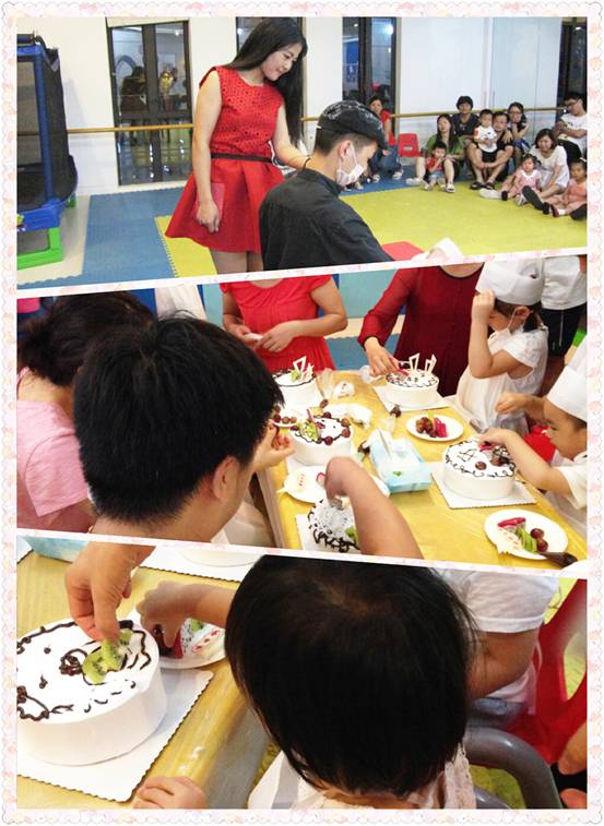 家長和寶貝們正在發(fā)揮自己的想象力動手DIY制作蛋糕