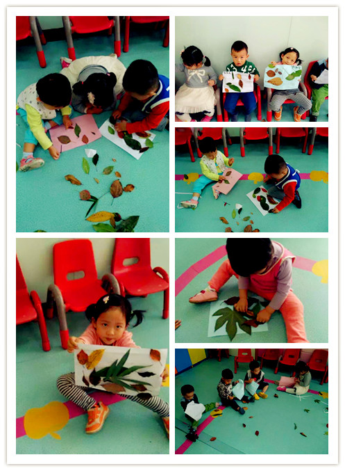 樹葉拼拼樂:寶貝們好認(rèn)真地在創(chuàng)作自己的大作呢