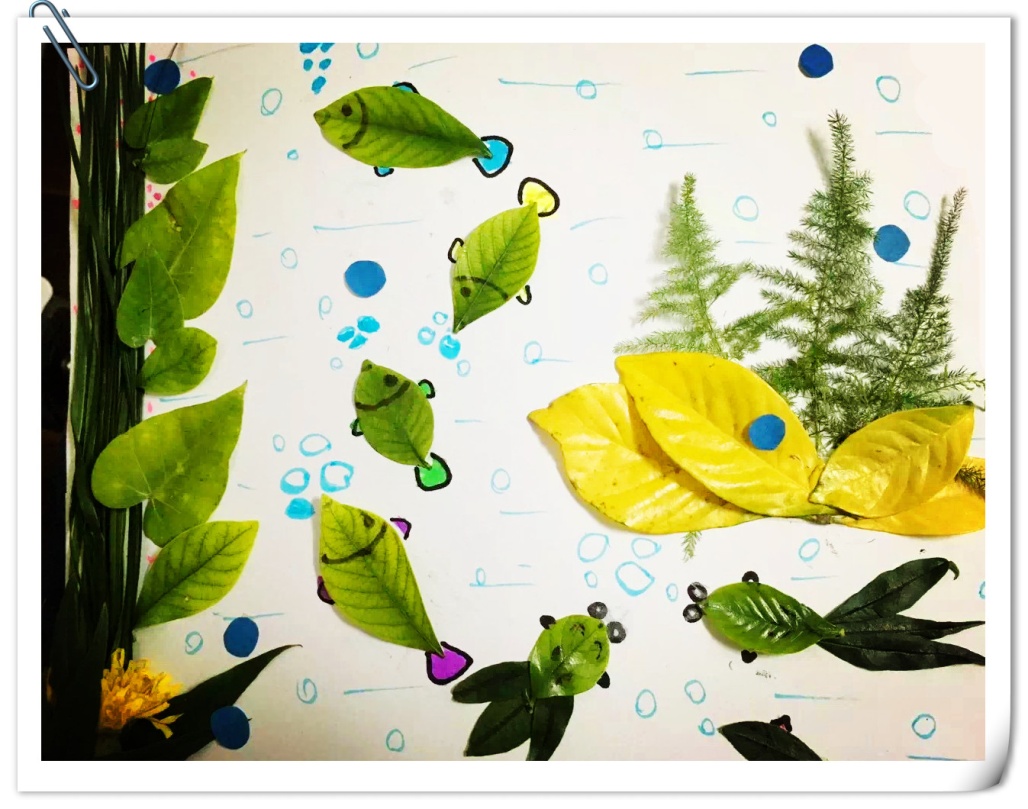 樹葉畫,孩子們的想象力是無限的,第一片樹葉放上去后,一連串的聯(lián)想就出來了。魚兒水里游、珊瑚叢、水藻、泡泡…多去了解孩子們飽滿的世界也讓讓大人收獲更多!