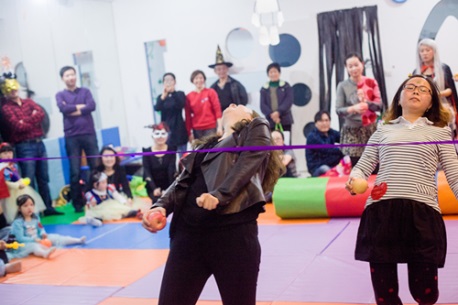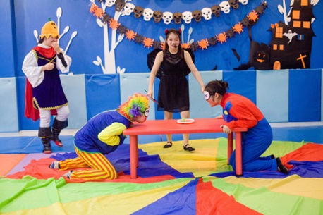 哇塞!我們的家長和寶寶們真的都好看極了,每個家庭都各有各的特色,真的是創(chuàng)意無限!很感謝我們的爸爸媽媽非常注重這次的晚會^^接下來是我們都萬眾期待的游戲環(huán)節(jié)啦~由各位老師示范表演了“傳遞幽靈湯”,這是需要家長寶寶們互相協(xié)作來完成的哦。游戲之前先跟著妖魔鬼怪們來活動活動自己的嘴巴~深呼吸?
