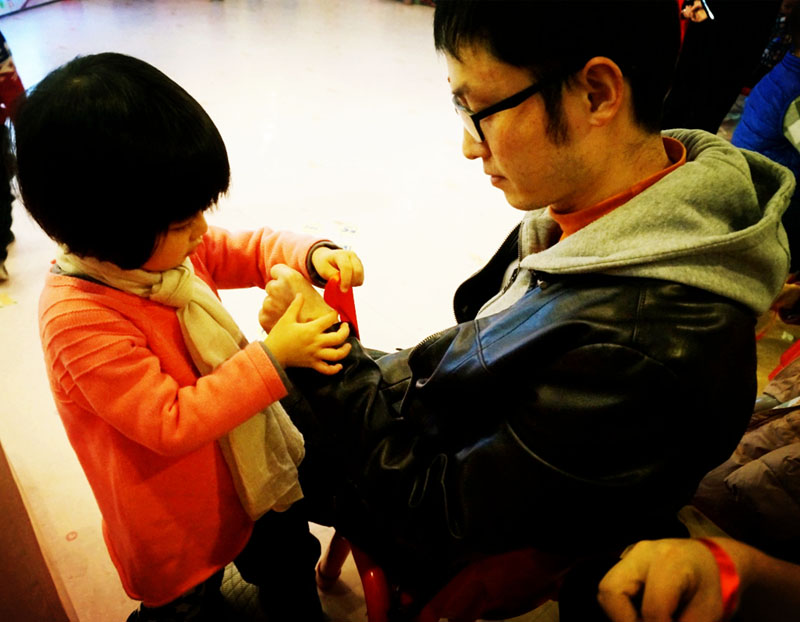 寶貝們?yōu)槲覀兊陌职謰寢寕兿瞪细卸鞯募t藍(lán)絲帶,為我們送出祝福。