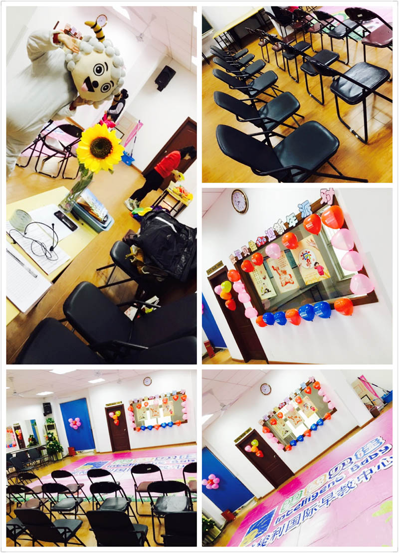 在老師們的布置下現(xiàn)場美美噠,窗邊掛滿了五顏六色的氣球,整齊的椅子等待著家長和寶寶們的到來。