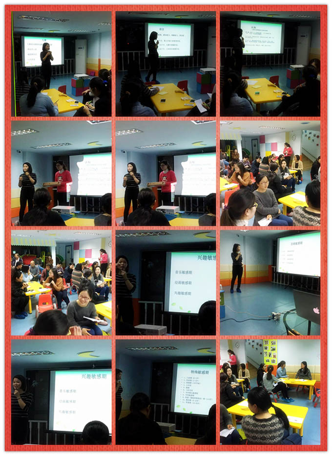 “兒童成長(zhǎng)重要的是教育,而不是天賦”,主講人Juliet老師有理有據(jù)地向講授了此觀點(diǎn)。并一一解釋了其中的主要理論,特別強(qiáng)調(diào)了敏感期原則。主講人告訴家長(zhǎng)們必須要滿足孩子成長(zhǎng)中敏感期的需要,在游戲中滿足孩子的好奇心和探索欲望。現(xiàn)場(chǎng)主講人向家長(zhǎng)展示了適合敏感期孩子玩的蒙特梭利的教具。看,有最經(jīng)典的插座圓柱體哦!