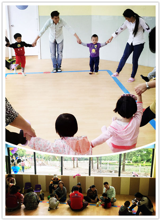 爸爸、媽媽、寶寶和老師倘祥在親子活動的快樂中。