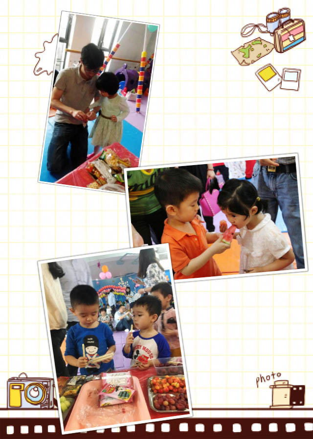 最后一環(huán)節(jié)是寶貝們的食物分享拍照留念。色彩繽紛的水果和美味佳肴的點(diǎn)心令寶寶們開心無比!