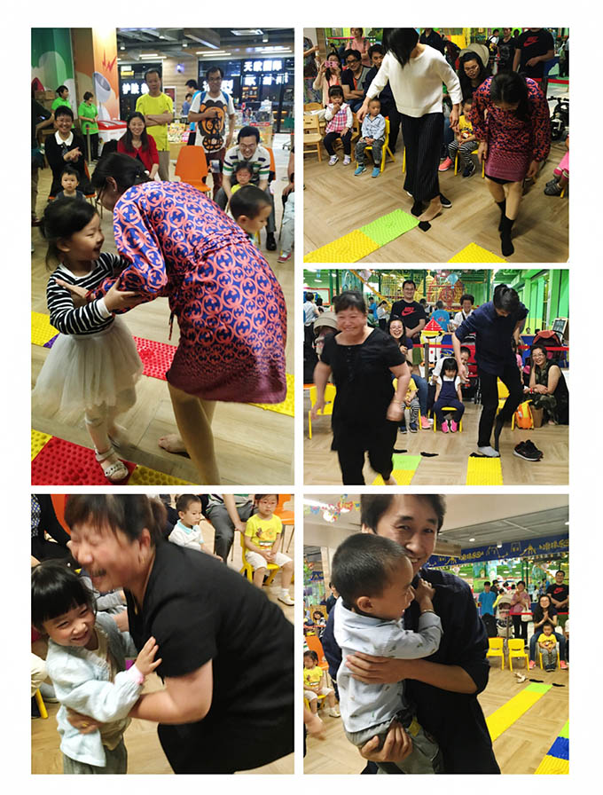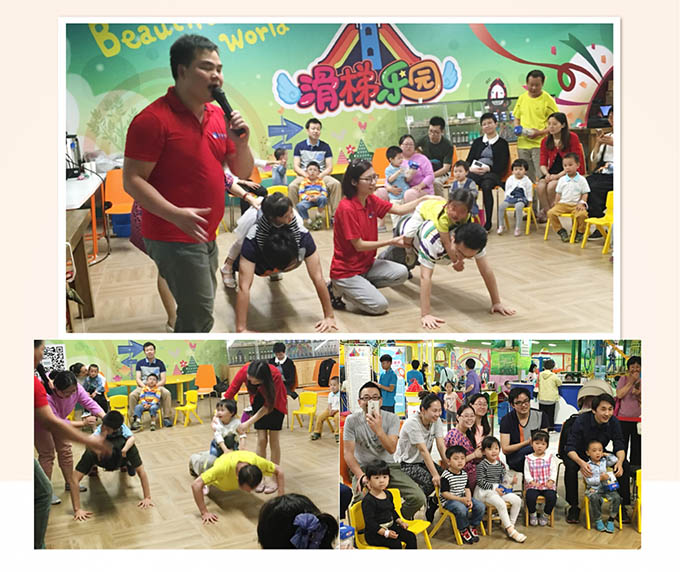 第二個游戲是強強父子兵,由一位家長把寶寶放在身上做俯臥撐,粑粑麻麻你追我趕競爭很激烈啊!