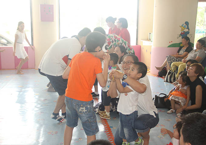 大象吃香蕉游戲就此結(jié)束,沒有參與的家庭也不要著急哦,我們的第二個游戲馬上就要開始啦!寶貝們快看,舞臺上出現(xiàn)了什么?好大的一張網(wǎng)呀!我們的爸爸媽媽要化身超人,帶上眼罩穿過巨大無比的蜘蛛網(wǎng),找到我們的寶寶,擁吻他們!看,我們的寶寶已經(jīng)激動的要沖上來了,快舉起你們的小手報名吧!