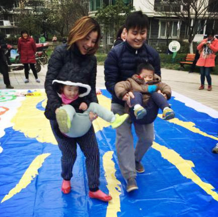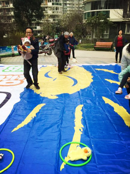 小樹做完了,我們要運動一下咯!一起來玩競技游戲吧!家長抱起寶寶,寶寶用雙腳夾住我們的小玩偶,把它運到指定圈圈,看誰運的多哦!