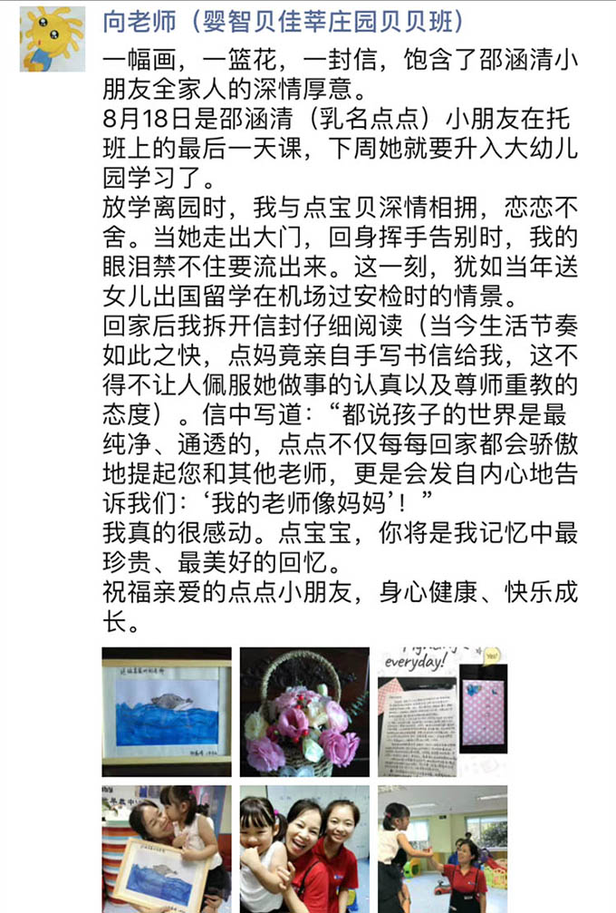 8月19日下午,嬰智貝佳兒童之家托管班主班老師向老師的一條朋友圈,感動(dòng)了很多人,也讓身為嬰智貝佳的一員感到一種驕傲,這是家長(zhǎng)對(duì)嬰智貝佳的一種認(rèn)可,也是一種激勵(lì)和動(dòng)力。嬰智貝佳這一個(gè)有愛的大家庭,在教育品質(zhì)的日益求精下,一群有愛的老師們積極向上。