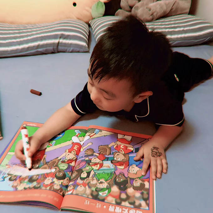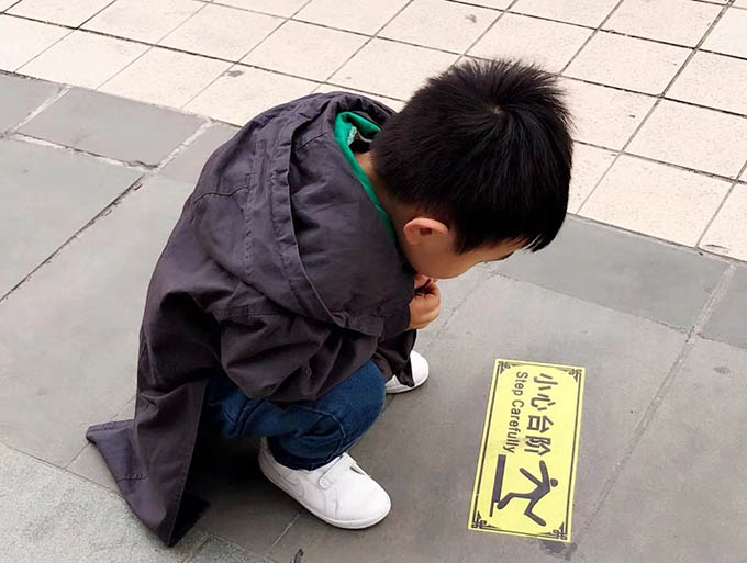 我在觀察地上的圖標(biāo),為什么會(huì)在地上呢?畫面上的人兒怎么要跌倒了?媽媽,真感謝您那時(shí)沒有打斷我。因?yàn)槲以谡J(rèn)真的做“研究工作”呢!