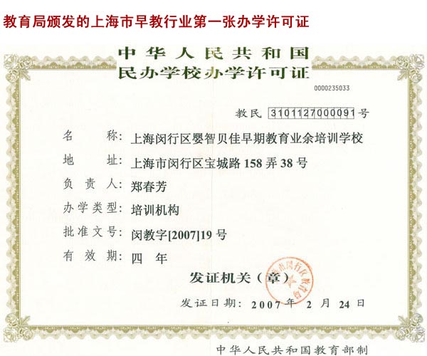 嬰智貝佳作為正規(guī)的早教中心,于2007年2月取得了上海市教育局頒發(fā)的上海市第一張早期教育辦學(xué)許可證,2018年獲得騰訊網(wǎng)“2018年度家長信賴兒童教育品牌”,嬰智貝佳的老師全都具備教師資格及育嬰師資格證書,教育部門有關(guān)專家定期到學(xué)校進(jìn)行專業(yè)指導(dǎo),教育質(zhì)量得到充分的保證,連續(xù)多年被評為優(yōu)秀民辦早教機(jī)構(gòu),所以嬰智貝佳在此特別提醒各位家長:在把您的孩子送去參加早教或有意加盟某家連鎖早教時,一定要其出示教育部門頒發(fā)的辦學(xué)許可證,以免您的利益受到損害。