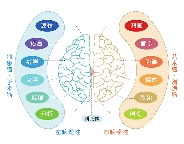 [注]本圖根據(jù)美國加州大學(xué)醫(yī)學(xué)博士斯佩里教授的“左右腦分工”論文理論繪制。
