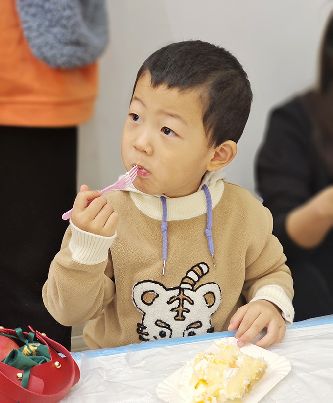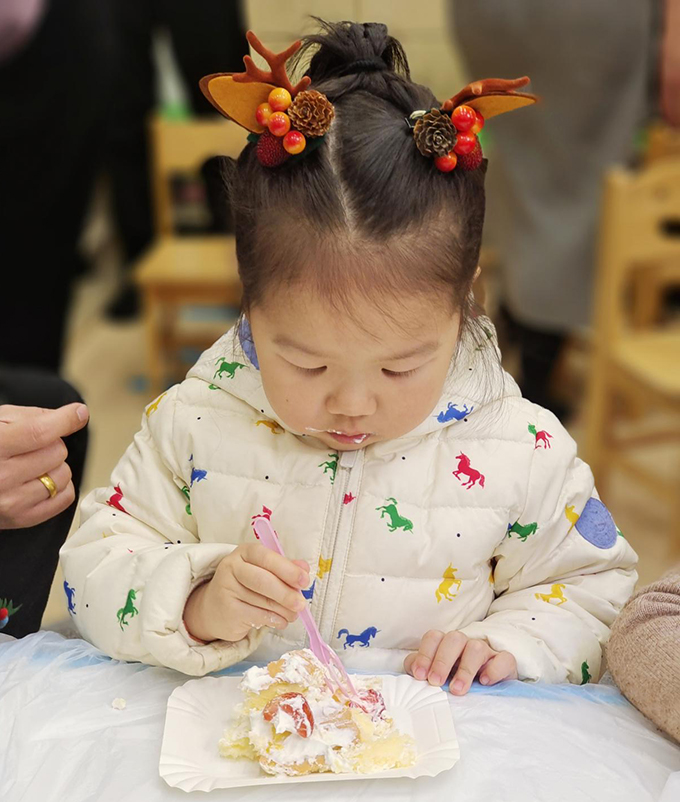原來(lái)這位好朋友是我們的圣誕老人~圣誕老人不僅給小朋友們帶來(lái)了精美的禮物,還為小朋友們帶來(lái)了可口的蛋糕。