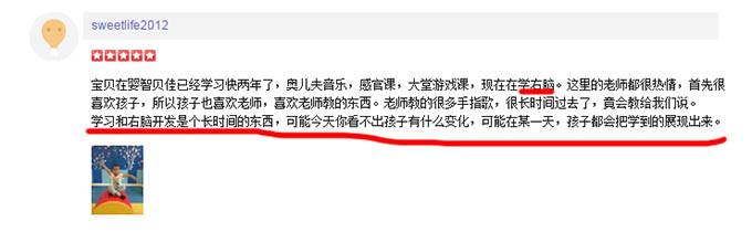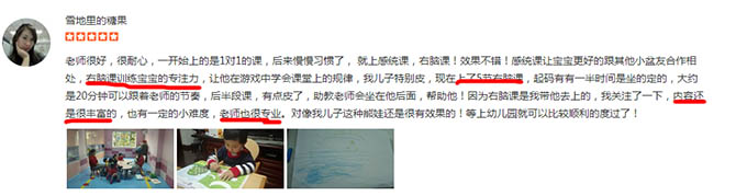老師很好,很耐心,一開始上的是1對1的課,后來慢慢習(xí)慣了, 就上感統(tǒng)課,右腦課!效果不錯!感統(tǒng)課讓寶寶更好的跟其他小盆友合作相處,右腦課訓(xùn)練寶寶的專注力,讓他在游戲中學(xué)會課堂上的規(guī)律,我兒子特別皮,現(xiàn)在上了5節(jié)右腦課,起碼有有一半時間是坐的定的,大約是20分鐘可以跟著老師的節(jié)奏,后半段課,有點皮了,助教老師會坐在他后面,幫助他!因為右腦課是我?guī)ド系?,我關(guān)注了一下,內(nèi)容還是很豐富的,也有一定的小難度,老師也很專業(yè)。對像我兒子這種熊娃還是很有效果的!等上幼兒園就可以比較順利的度過了!