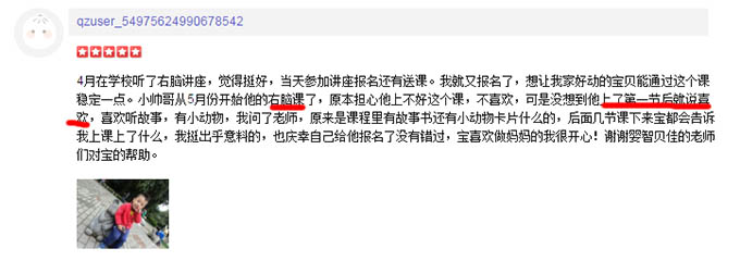 4月在學(xué)校聽了右腦講座,覺得挺好,當(dāng)天參加講座報名還有送課。我就又報名了,想讓我家好動的寶貝能通過這個課穩(wěn)定一點。小帥哥從5月份開始他的右腦課了,原本擔(dān)心他上不好這個課,不喜歡,可是沒想到他上了第一節(jié)后就說喜歡,喜歡聽故事,有小動物,我問了老師,原來是課程里有故事書還有小動物卡片什么的,后面幾節(jié)課下來寶都會告訴我上課上了什么,我挺出乎意料的,也慶幸自己給他報名了沒有錯過,寶喜歡做媽媽的我很開心!謝謝嬰智貝佳的老師們對寶的幫助。