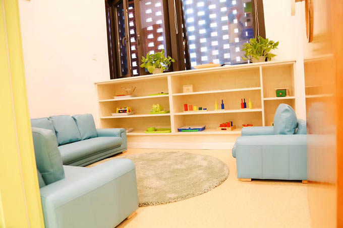 大堂右邊的一個(gè)非常溫馨教室就是平時(shí)老師們與家長(zhǎng)寶寶VIP互動(dòng)室,以及寶寶的情緒安撫室。
